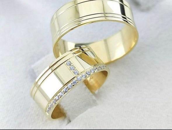 Detalhes Diferenciados: Ambas as alianças possuem faixas de filetes (frisos) polidos que contornam o design.